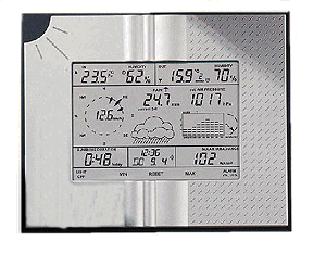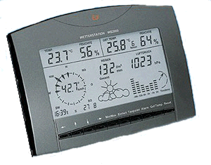 S 2500 H für Helligkeit und Sonnenscheindauer   Wegweisendes Design in edler Aluminium-Optik und neue Ausstattungsfeatures wie super-einfache Bedienung über ein Touch-Screen-Display und neue Anzeigen- und Automatikfunktionen machen die WS 2500 wieder zum Maßstab sowohl für die private als auch die semiprofessionelle Wetterbeobachtung. Die WS 2500 vereinigt wohl alle relevanten Wetterstatusinformationen einschließlich ihrer Verläufe (bis zu 8 Tagen zurückverfolgbar) bei trotzdem übersichtlicher Anzeige - eigentlich fehlt nur noch der Satellitenbild-Direktempfang! Die Wetterstation ist mit zahlreichen Sensoren wie bis zu 8 externen Temperatur-/ Luftfeuchtesensoren, Regenmengenmesser, Windsensor, Helligkeitssensor zu einem professionellen Wetterbeobachtungsnetz ausbaubar. Die diversen Sensoren arbeiten je nach Einsatzort autark batterie- oder solarversorgt und übermitteln ihre Daten per Funk an die Wetterstation. Herausragendes Merkmal der WS 2500 ist das neue Touch-Screen-Display, das die Bedienung der komplexen Wetterstation sehr einfach macht, muss man sich doch nicht mit vielfältigen Tastenkombinationen durch Menüs „kämpfen” - einfach das gewünschte Feld antippen und dann alles über den jeweiligen Wert erfahren: aktuelle Werte in verschiedenen Interpretationen, Verläufe, Extremwerte mit zugehörigem Datum und Zeit... Insgesamt sind im Display 26 intuitiv zu bedienende „Tasten” integriert. Welche Anzeigemöglichkeiten die WS 2500 hat, ist in der Funktionsübersicht zusammengestellt. Das riesige LC-Display (sichtbare Fläche 157 x 111 mm) ist bei Bedarf beleuchtbar. Die Beleuchtung kann je nach Art der Spannungsversorgung, für Zeiten bis zu 9:59 h bzw. auch permanent (Netzteil im Lieferumfang enthalten) oder 0-60 sec. (Batteriebetrieb) ohne separates Netzteil eingeschaltet werden. Die Spannungsversorgung kann wahlweise für den völlig kabellosen Betrieb per Batterie oder aber per mitgeliefertem Netzteil erfolgen. Für den semiprofessionellen Anspruch ist die Wetterstation mit einer RS-232- Schnittstelle ausgestattet und kann so zur Datenerfassung, -auswertung, zum Speichern, Exportieren und Ausdrucken der Wetterdaten auf einem PC genutzt werden (nicht kompatibel zur PC WS 2000). Natürlich gehört zum Ausstattungsumfang der WS 2500 eine interne DCF-Funkuhr, die Zeit, Datum und Wochentag immer höchst genau anzeigt und dazu auch noch über einen Wecker mit 8 Alarmzeiten verfügt. Apropos Alarm: die Wetterstation erlaubt die Eingabe diverser Alarmwerte, etwa für das Überschreiten einer bestimmten Windgeschwindigkeit, Frostgefahr, Unterschreiten eines bestimmten Luftdrucks (Sturmwarnung) usw. Bei Erreichen der definierten Werte alarmiert die Wetterstation optisch/akustisch ihren Besitzer. Zur Erfassung der zahlreichen, per Funk empfangenen Informationen arbeitet die Wetterstation voll automatisiert: sowohl der exakte Zeitempfang wird ständig überprüft bzw. aktualisiert als auch der Empfang der Sensorendaten. Ist z. B. einer der bis zu 100 m (Freifeldreichweite, in Gebäuden je nach Bausubstanz weniger) entfernt platzierbaren Wettersensoren gestört, lässt die WS 2500 „nicht locker”, bis sie den Sensor wieder empfängt. Auch nach längerem Sensorausfall, z. B. bei Batterieausfall oder anhaltender Funkstörung, nimmt die Wetterstation den Sensor automatisch wieder in das System auf. Dies trifft auch für neu ins System gekommene Sensoren zu. Eine manuelle Einbindung ist also nicht erforderlich! Wahlweise Wandaufhängung oder Tischaufstellung möglich. Lieferung mit Netzteil und integriertem Sensor für Innen-Temperatur/-Luftfeuchte und Luftdruck.